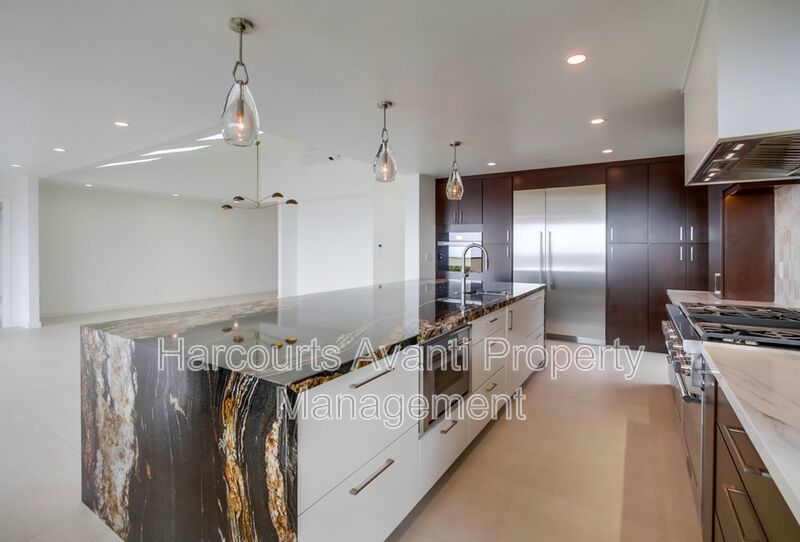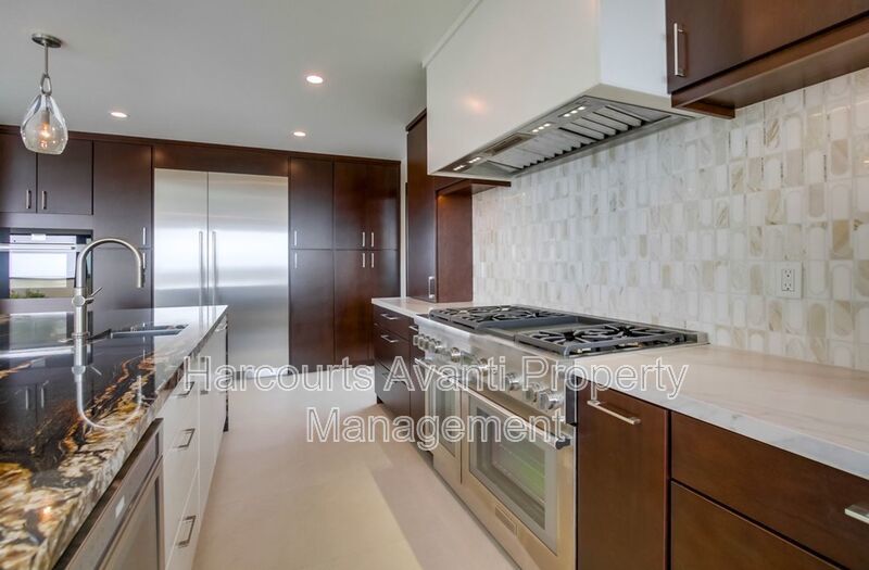 Enjoy ocean views from your private outdoor oasis, featuring a built-in BBQ, beverage fridge, custom firepit, and a two-way fireplace perfect for entertaining. The chef’s kitchen showcases a massive waterfall island, Thermador range, Miele oven, custom tile backsplash, and soft-close cabinetry. Every detail has been considered, from custom tile flooring throughout to built-in closets in each bedroom.